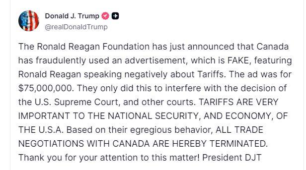 美国总统特朗普通过社交媒体宣布,美国终止与加拿大的所有贸易谈判。特朗普表示,罗纳德·里根基金会刚刚宣布加拿大发布了一则虚假广告,广告中前总统里根对关税发表了负面言论