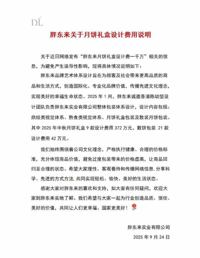 9月24日晚上,胖东来官方抖音号发布关于月饼礼盒设计费用的说明。针对近日网络上流传的“胖东来月饼礼盒设计费一千万”的信息,公司为避免误导,特此澄清