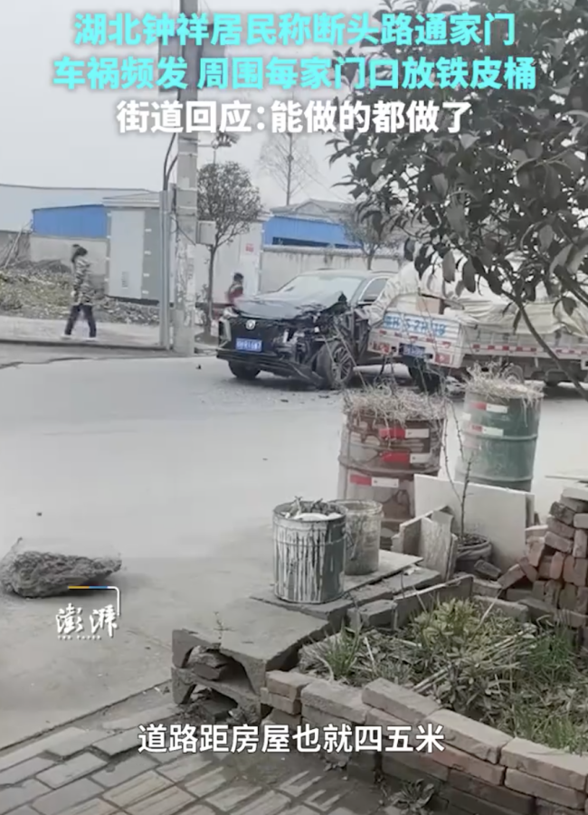 湖北居民称门口断头路车祸频发。近日,湖北钟祥市陈先生向澎湃新闻反映,一条断头路直面自己家门,车祸频发,邻居每家门口都挡着铁皮桶。郢中街道办工作人员回应,已向上反映,但路的规划建设由市政部门决定。湖北居民称门口断头路车祸频发湖北居民称门口断头...